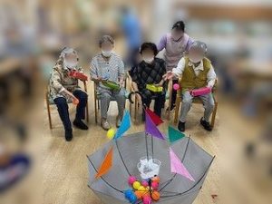ボールが傘に入れば1つ1点、コップの中に入れば1つ2点