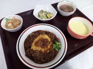8/14(木)には、オムハヤシライス・デザートは桃のコンポート