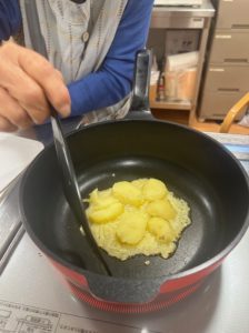 フライパンにバターを溶かして、チーズとポテトを焼いていきます
