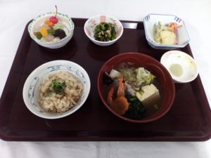 2/23(月)は鶏五目御飯、寄せ鍋、ミニ天ぷら、菜の花の和え物、あんみつを提供しました。