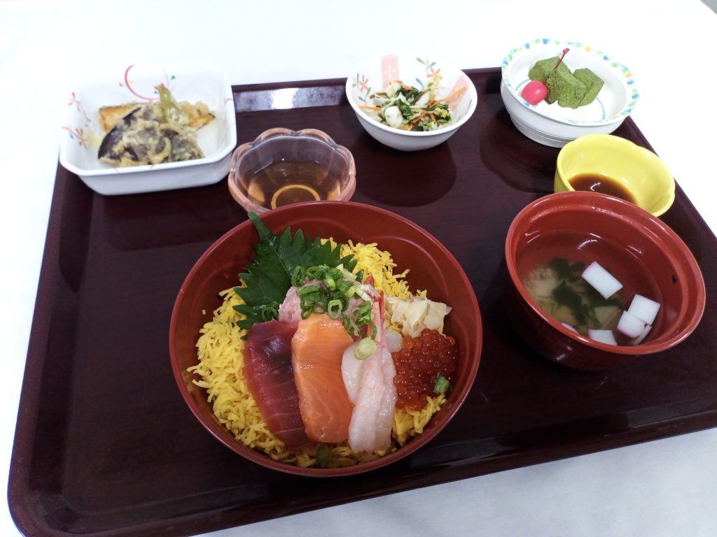 9/15(月)の敬老の日と9/23(火)秋分の日にお楽しみメニューを提供しました。 9/15(月)は、海鮮丼・ミニ天ぷら・わらび餅(抹茶) 海鮮丼は、まぐろ、サーモン、甘えび、ホタテがのり、 ミニ天ぷらもつき、彩りもきれいに仕上がりま...