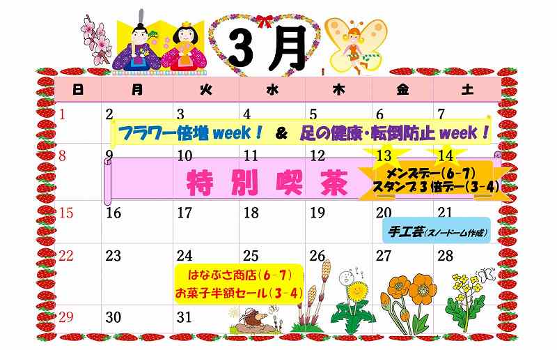 みなさまこんにちは。 3月のイベントカレンダーです☆ 来月も色々なイベントを予定しています。 なお、栄養ケアサービスと口腔機能向上サービスは、 一部のご利用者様が対象となります。 予...