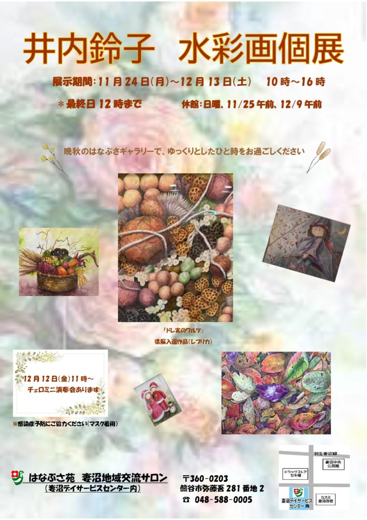 11月24日(月)から「井内鈴子 水彩画個展」を開催しています 12月12日(金)11時から30分ほどの チェロミニ演奏会も行われます みなさま お誘いあわせの上、ご来場ください